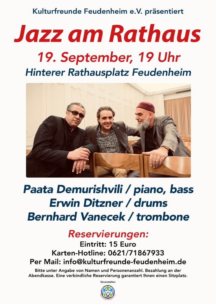 Tasten-Virtuose Paata Demurishvili und Schlagzeug-Meister Erwin Ditzner, da sind sich Fachpresse und Publikum einig, zählen europaweit zu den allerbesten ihres Fachs. Daher kann man die beiden Top-Musiker aus der Metropolregion eigentlich auch eher auf der großen Bühne hören. Weil sie sich aber im kleinen Rahmen auch sehr wohl fühlen, haben sie das Projekt DVD ins Leben gerufen. Mit von der Partie in diesem Trio ist der Posaunist Bernhard Vanecek an der Posaune !